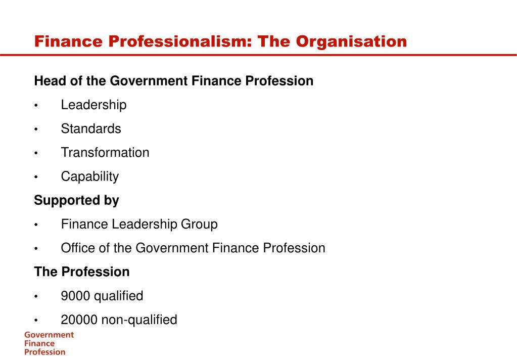 Finance Professionalism: The Organisation Head of the Government Finance Profession • Leadership • Standards • Transformation • Capability Supported by • Finance Leadership Group • Office of the Government Finance Profession The Profession • 9000 qualified • 20000 non-qualified