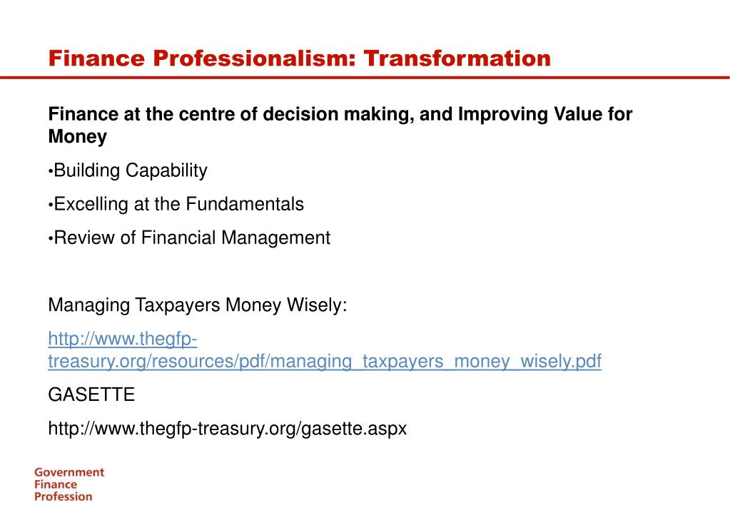 Finance Professionalism: Transformation Finance at the centre of decision making, and Improving Value for Money • Building Capability • Excelling at the Fundamentals • Review of Financial Management Managing Taxpayers Money Wisely: http://www.thegfp-treasury.org/resources/pdf/managing_taxpayers_money_wisely.pdf GASETTE http://www.thegfp-treasury.org/gasette.aspx
