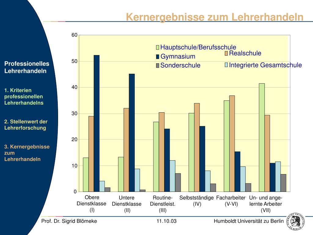 60 Hauptschule/Berufsschule Realschule Gymnasium 50 Integrierte Gesamtschule Sonderschule 40 30 20 10 0 Obere Dienstklasse (I) Untere Dienstklasse (II) Routine- Dienstleist. (III) Selbstständige (IV) Facharbeiter (V-VI) Un- und ange- lernte Arbeiter (VII) Kernergebnisse zum Lehrerhandeln Prof. Dr. Sigrid Blömeke