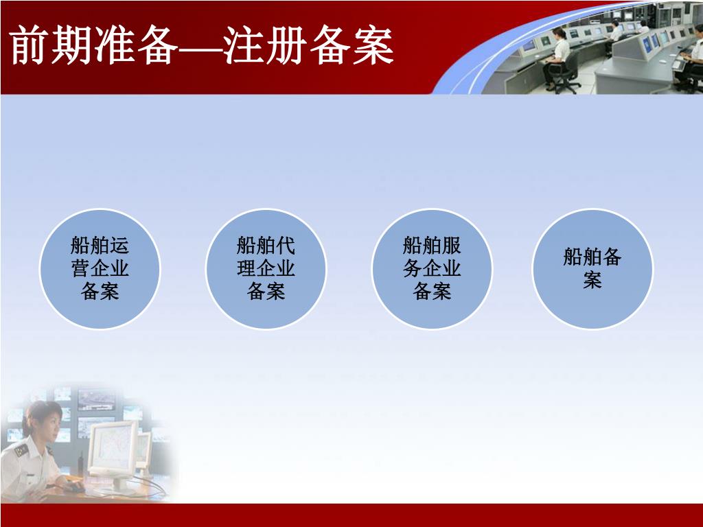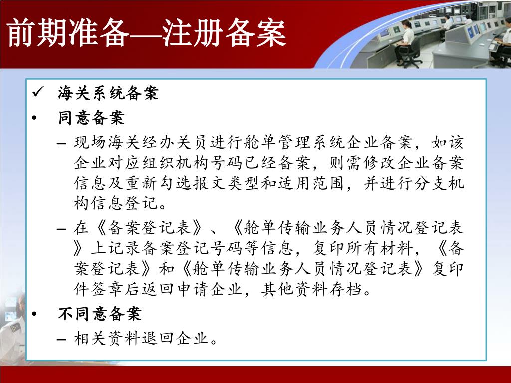 前期准备—注册备案 • 海关系统备案 • 同意备案 • 现场海关经办关员进行舱单管理系统企业备案,如该企业对应组织机构号码已经备案,则需修改企业备案信息及重新勾选报文类型和适用范围,并进行分支机构信息登记。 • 在《备案登记表》、《舱单传输业务人员情况登记表》上记录备案登记号码等信息,复印所有材料,《备案登记表》和《舱单传输业务人员情况登记表》复印件签章后返回申请企业,其他资料存档。 • 不同意备案 • 相关资料退回企业。