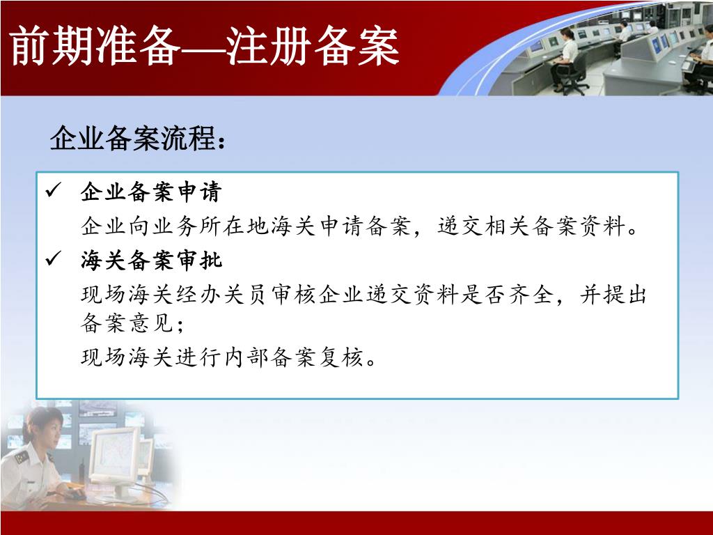 前期准备—注册备案 企业备案流程: • 企业备案申请 企业向业务所在地海关申请备案,递交相关备案资料。 • 海关备案审批 现场海关经办关员审核企业递交资料是否齐全,并提出备案意见; 现场海关进行内部备案复核。