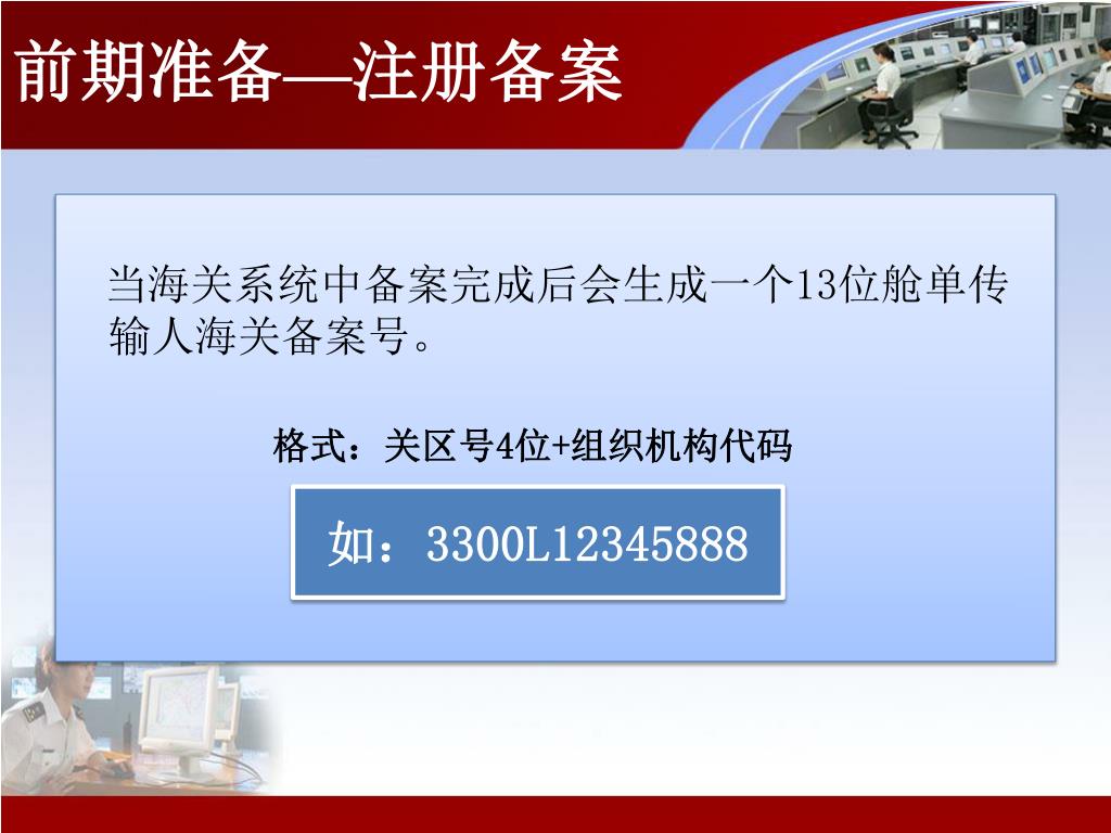 前期准备—注册备案 如:3300L12345888 当海关系统中备案完成后会生成一个13位舱单传输人海关备案号。 格式:关区号4位+组织机构代码
