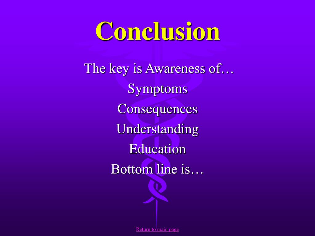 Conclusion The key is Awareness of… Symptoms Consequences Understanding Education Bottom line is… Return to main page