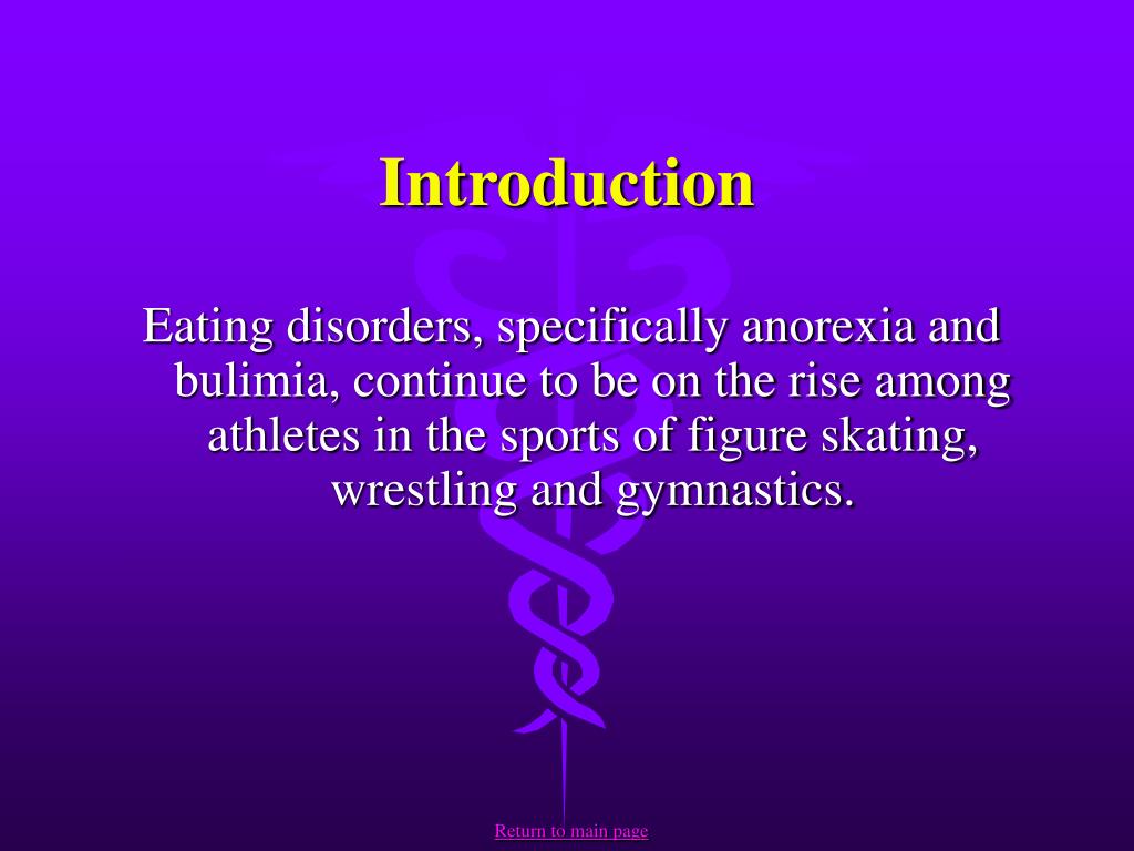 Introduction Eating disorders, specifically anorexia and bulimia, continue to be on the rise among athletes in the sports of figure skating, wrestling and gymnastics. Return to main page