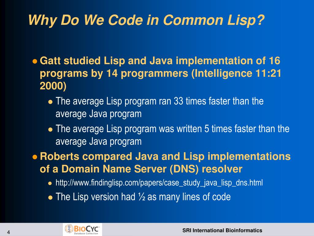 Why Do We Code in Common Lisp? • Gatt studied Lisp and Java implementation of 16 programs by 14 programmers (Intelligence 11:21 2000) • The average Lisp program ran 33 times faster than the average Java program • The average Lisp program was written 5 times faster than the average Java program • Roberts compared Java and Lisp implementations of a Domain Name Server (DNS) resolver • http://www.findinglisp.com/papers/case_study_java_lisp_dns.html • The Lisp version had ½ as many lines of code