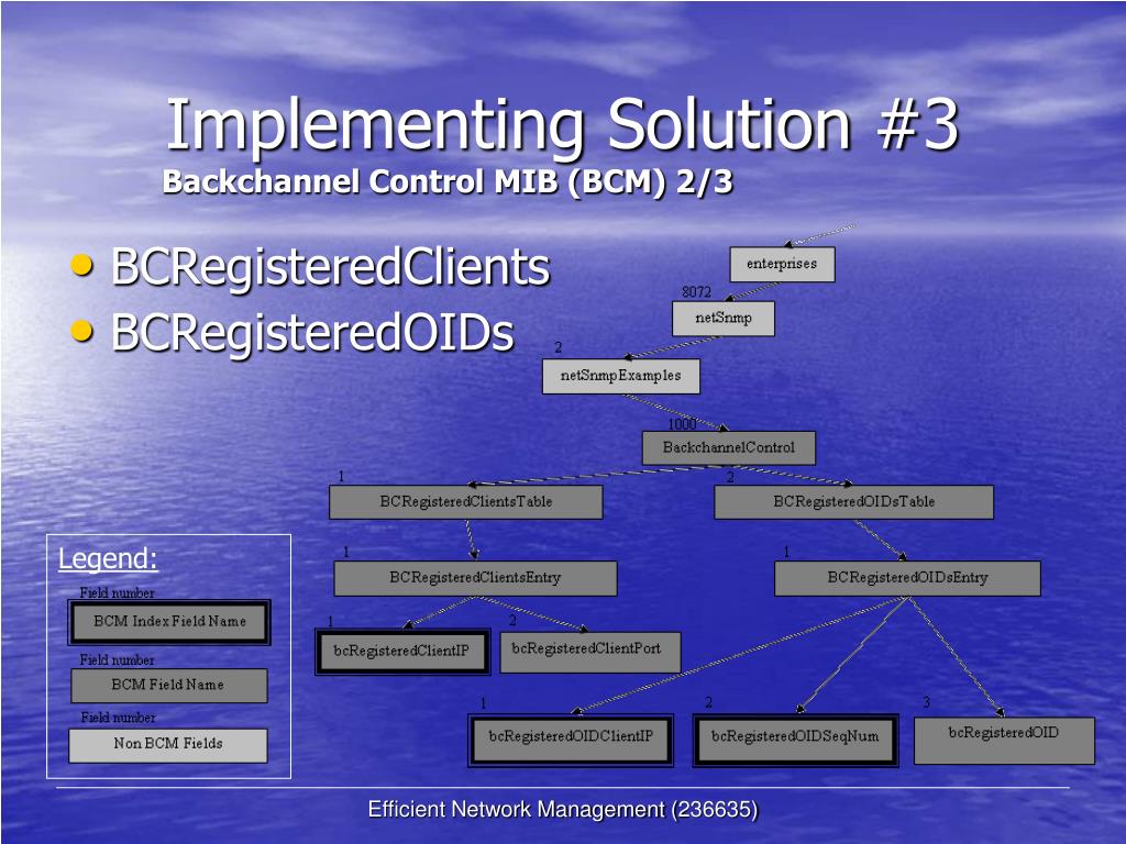 Implementing Solution #3 Backchannel Control MIB (BCM) 2/3 • BCRegisteredClients • BCRegisteredOIDs Legend: Efficient Network Management (236635)