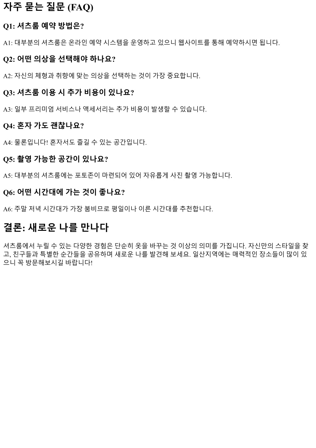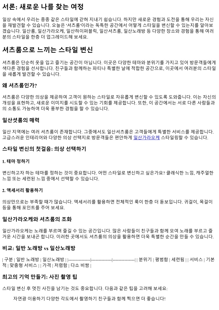 2. 자주묻는질문 (FAQ) Q1: 셔츠룸예약방법은? A1: 대부분의셔츠룸은온라인예약시스템을운영하고있으니웹사이트를통해예약하시면됩니다. Q2: 어떤의상을선택해야하나요? A2: 자신의체형과취향에맞는의상을선택하는것이가장중요합니다. Q3: 셔츠룸이용시추가비용이있나요? A3: 일부프리미엄서비스나액세서리는추가비용이발생할수있습니다. Q4: 혼자가도괜찮나요? A4: 물론입니다! 혼자서도즐길수있는공간입니다. Q5: 촬영가능한공간이있나요? A5: 대부분의셔츠룸에는포토존이마련되어있어자유롭게사진촬영가능합니다. Q6: 어떤시간대에가는것이좋나요? A6: 주말저녁시간대가가장붐비므로평일이나이른시간대를추천합니다. 결론: 새로운나를만나다 셔츠룸에서누릴수있는다양한경험은단순히옷을바꾸는것이상의의미를가집니다. 자신만의스타일을찾 고, 친구들과특별한순간들을공유하며새로운나를발견해보세요. 일산지역에는매력적인장소들이많이있 으니꼭방문해보시길바랍니다!