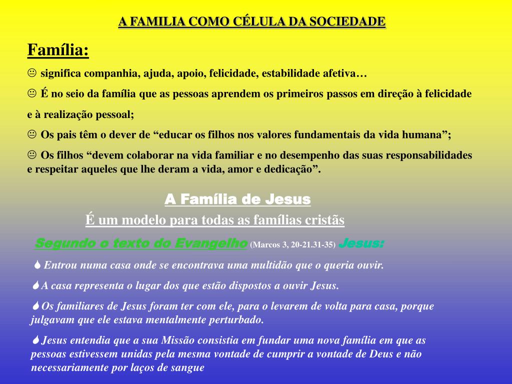 A FAMILIA COMO CÉLULA DA SOCIEDADE Família: • significa companhia, ajuda, apoio, felicidade, estabilidade afetiva… • É no seio da família que as pessoas aprendem os primeiros passos em direção à felicidade e à realização pessoal; • Os pais têm o dever de “educar os filhos nos valores fundamentais da vida humana”; • Os filhos “devem colaborar na vida familiar e no desempenho das suas responsabilidades e respeitar aqueles que lhe deram a vida, amor e dedicação”. A Família de Jesus É um modelo para todas as famílias cristãs Segundo o texto do Evangelho(Marcos 3, 20-21.31-35) Jesus: Entrou numa casa onde se encontrava uma multidão que o queria ouvir. A casa representa o lugar dos que estão dispostos a ouvir Jesus. Os familiares de Jesus foram ter com ele, para o levarem de volta para casa, porque julgavam que ele estava mentalmente perturbado. Jesus entendia que a sua Missão consistia em fundar uma nova família em que as pessoas estivessem unidas pela mesma vontade de cumprir a vontade de Deus e não necessariamente por laços de sangue