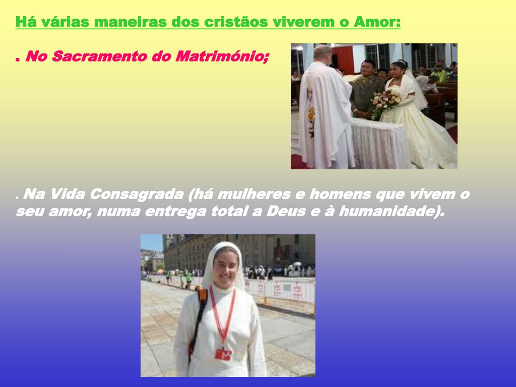 Há várias maneiras dos cristãos viverem o Amor: . No Sacramento do Matrimónio; . Na Vida Consagrada (há mulheres e homens que vivem o seu amor, numa entrega total a Deus e à humanidade).
