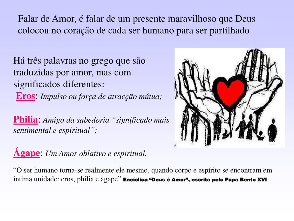 Falar de Amor, é falar de um presente maravilhoso que Deus colocou no coração de cada ser humano para ser partilhado Há três palavras no grego que são traduzidas por amor, mas com significados diferentes: Eros: Impulso ou força de atracção mútua; Philia: Amigo da sabedoria “significado mais sentimental e espiritual”; Ágape: Um Amor oblativo e espiritual. “O ser humano torna-se realmente ele mesmo, quando corpo e espírito se encontram em intima unidade: eros, philia e ágape”.Encíclica “Deus é Amor”, escrita pelo Papa Bento XVI