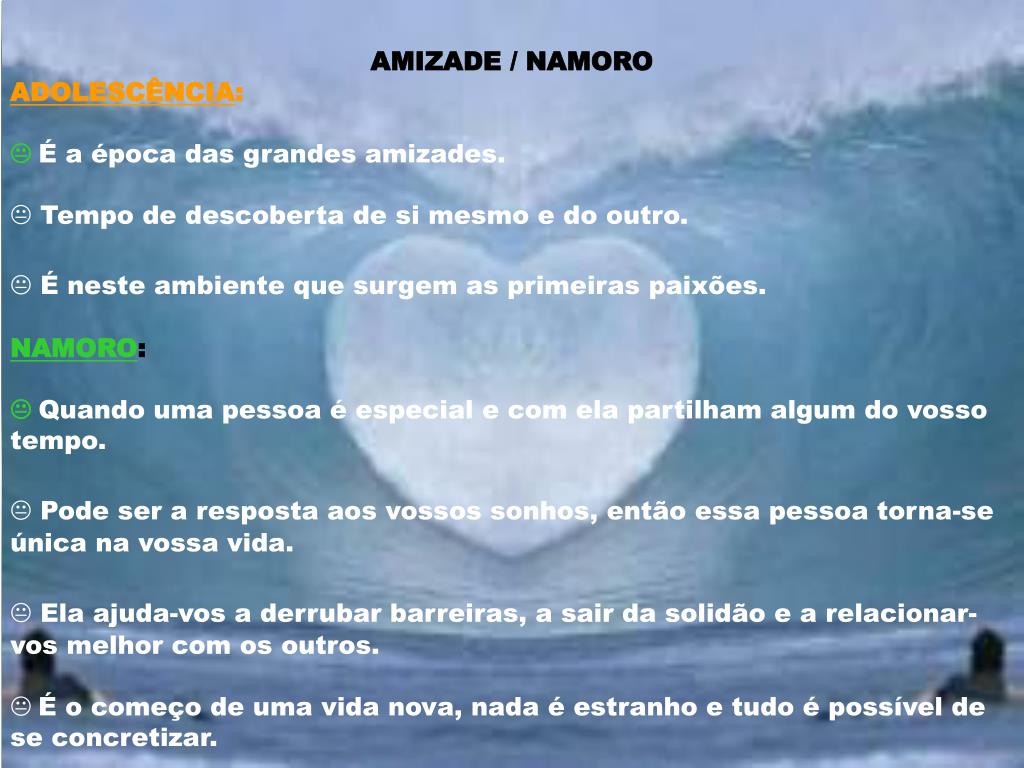 AMIZADE / NAMORO ADOLESCÊNCIA: É a época das grandes amizades. Tempo de descoberta de si mesmo e do outro. É neste ambiente que surgem as primeiras paixões. NAMORO: Quando uma pessoa é especial e com ela partilham algum do vosso tempo. Pode ser a resposta aos vossos sonhos, então essa pessoa torna-se única na vossa vida. Ela ajuda-vos a derrubar barreiras, a sair da solidão e a relacionar-vos melhor com os outros. É o começo de uma vida nova, nada é estranho e tudo é possível de se concretizar.
