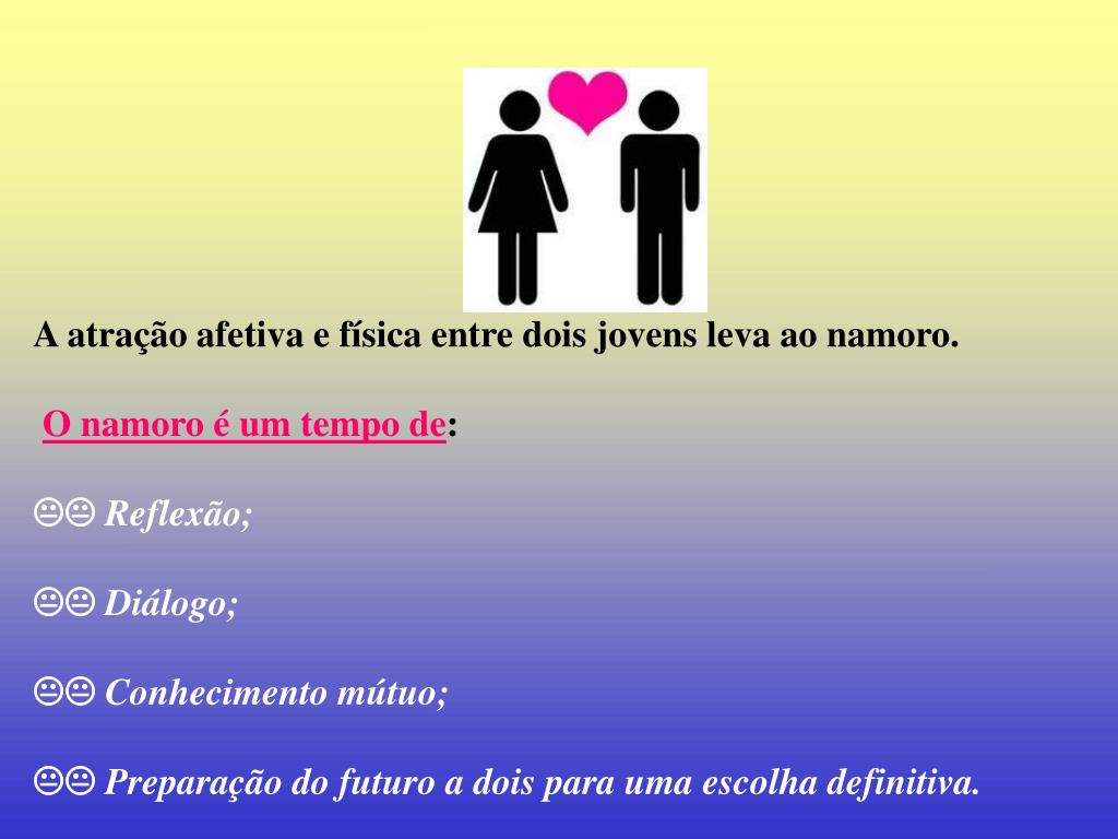 A atração afetiva e física entre dois jovens leva ao namoro. O namoro é um tempo de: Reflexão; Diálogo; Conhecimento mútuo; Preparação do futuro a dois para uma escolha definitiva.