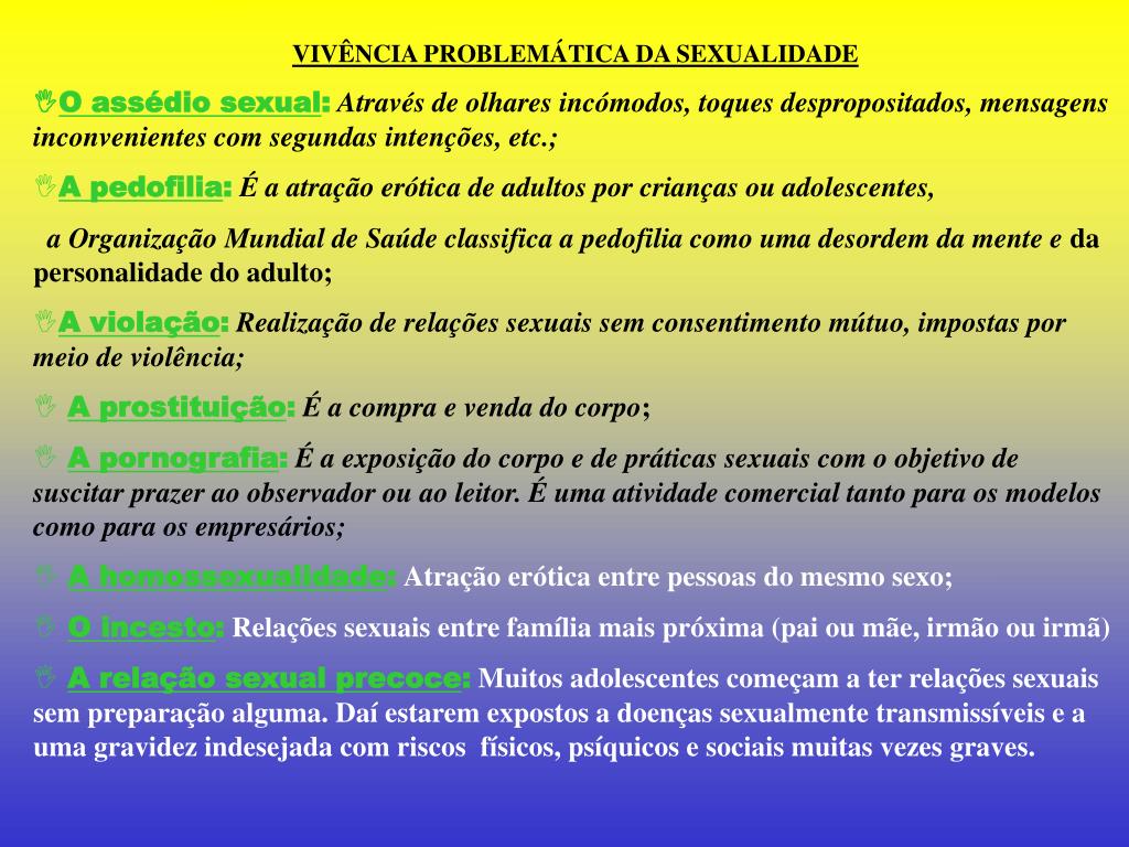 VIVÊNCIA PROBLEMÁTICA DA SEXUALIDADE • O assédio sexual:Através de olhares incómodos, toques despropositados, mensagensinconvenientes com segundas intenções, etc.; • A pedofilia:É a atração erótica de adultos por crianças ou adolescentes, • a Organização Mundial de Saúde classifica a pedofilia como uma desordem da mente e da personalidade do adulto; • A violação:Realização de relações sexuais sem consentimento mútuo, impostas por meio de violência; • A prostituição:É a compra e venda do corpo; • A pornografia:É a exposição do corpo e de práticas sexuais com o objetivo de suscitarprazer ao observador ou ao leitor. É uma atividade comercial tanto para os modelos como para os empresários; • A homossexualidade:Atração erótica entre pessoas do mesmo sexo; • O incesto:Relações sexuais entre família mais próxima (pai ou mãe, irmão ou irmã) • A relação sexual precoce:Muitos adolescentes começam a ter relações sexuais sem preparação alguma. Daí estarem expostos a doenças sexualmente transmissíveis e a uma gravidez indesejada com riscos físicos, psíquicos e sociais muitas vezes graves.
