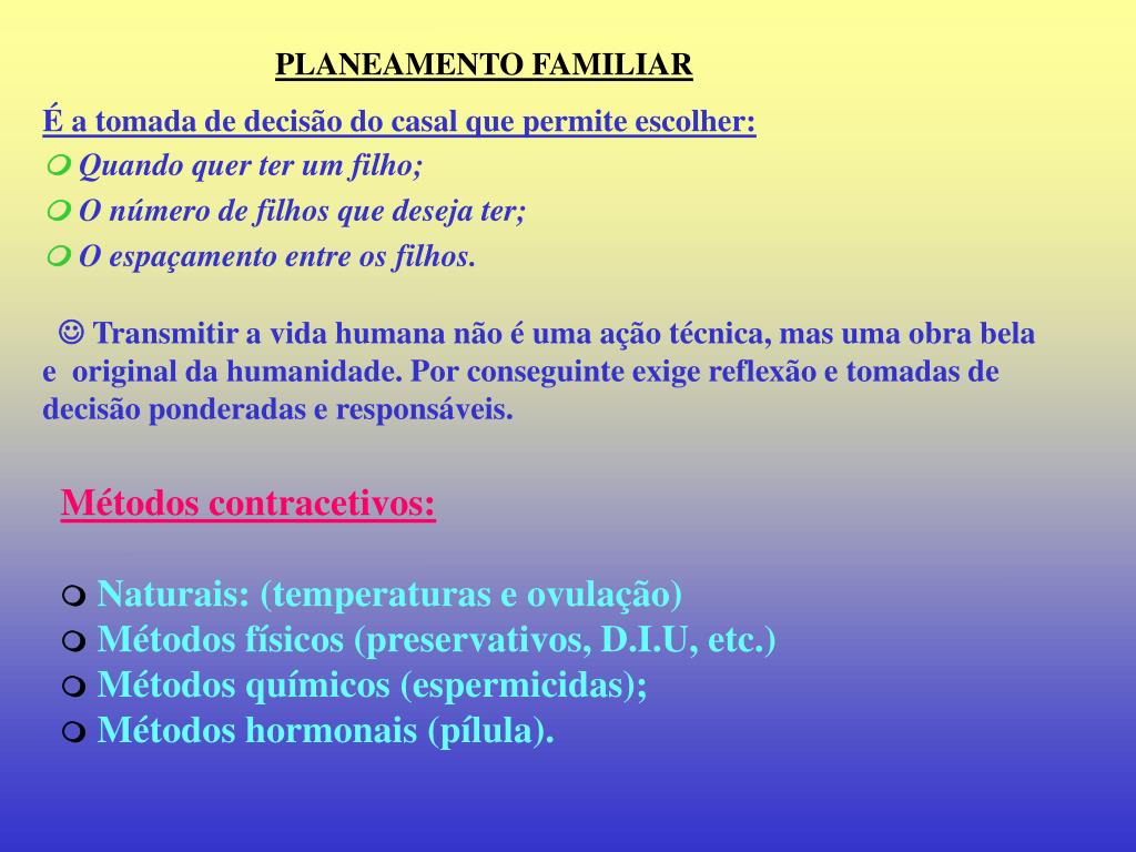 PLANEAMENTO FAMILIAR É a tomada de decisão do casal que permite escolher:Quando quer ter um filho; O número de filhos que deseja ter; O espaçamento entre os filhos. Transmitir a vida humana não é uma ação técnica, mas uma obra bela e original da humanidade. Por conseguinte exige reflexão e tomadas de decisão ponderadas e responsáveis. Métodos contracetivos: Naturais: (temperaturas e ovulação) Métodos físicos (preservativos, D.I.U, etc.) Métodos químicos (espermicidas); Métodos hormonais (pílula).