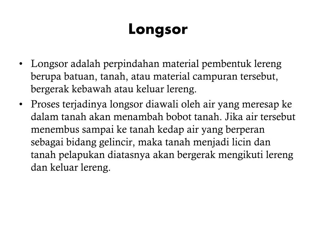Longsor • Longsor adalah perpindahan material pembentuk lereng berupa batuan, tanah, atau material campuran tersebut, bergerak kebawah atau keluar lereng. • Proses terjadinya longsor diawali oleh air yang meresap ke dalam tanah akan menambah bobot tanah. Jika air tersebut menembus sampai ke tanah kedap air yang berperan sebagai bidang gelincir, maka tanah menjadi licin dan tanah pelapukan diatasnya akan bergerak mengikuti lereng dan keluar lereng.