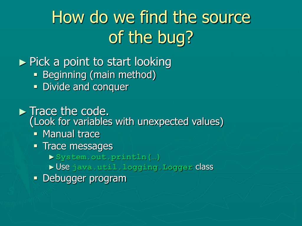 How do we find the sourceof the bug? • Pick a point to start looking • Beginning (main method) • Divide and conquer • Trace the code. (Look for variables with unexpected values) • Manual trace • Trace messages • System.out.println(…) • Use java.util.logging.Logger class • Debugger program