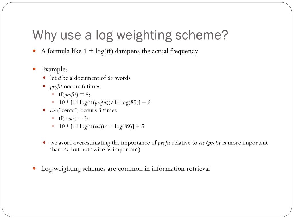 Why use a log weighting scheme? • A formula like 1 + log(tf) dampens the actual frequency • Example: • let d be a document of 89 words • profit occurs 6 times • tf(profit) = 6; • 10 * [1+log(tf(profit))/1+log(89)] = 6 • cts (“cents”) occurs 3 times • tf(cents)= 3; • 10 * [1+log(tf(cts))/1+log(89)] = 5 • we avoid overestimating the importance of profit relative to cts (profit is more important than cts, but not twice as important) • Log weighting schemes are common in information retrieval