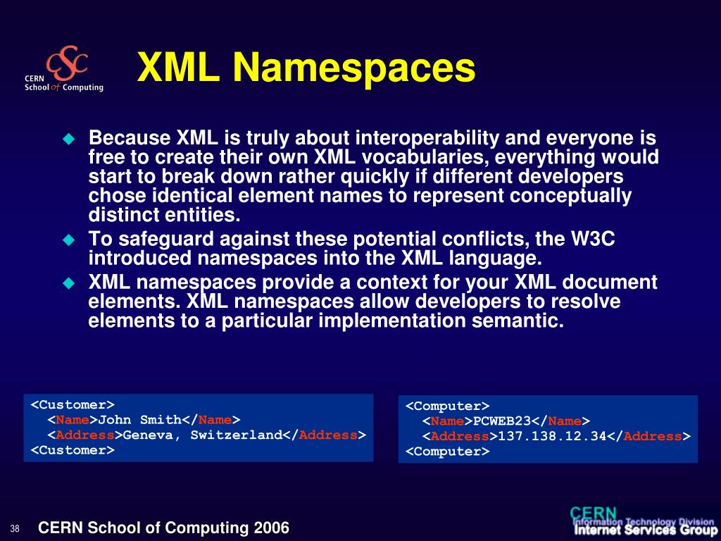 XML Namespaces • Because XML is truly about interoperability and everyone is free to create their own XML vocabularies, everything would start to break down rather quickly if different developers chose identical element names to represent conceptually distinct entities. • To safeguard against these potential conflicts, the W3C introduced namespaces into the XML language. • XML namespaces provide a context for your XML document elements. XML namespaces allow developers to resolve elements to a particular implementation semantic. <Customer> <Name>John Smith</Name> <Address>Geneva, Switzerland</Address> <Customer> <Computer> <Name>PCWEB23</Name> <Address>137.138.12.34</Address> <Computer>