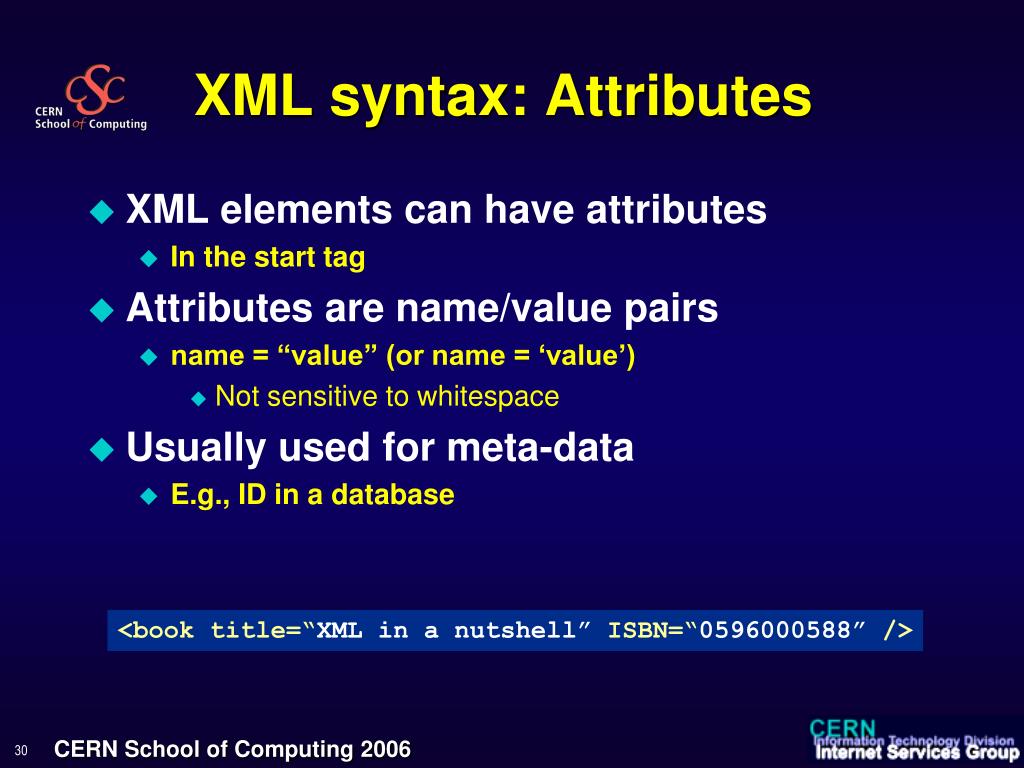 XML syntax: Tags • Start tags begin with “<” • End tags begin with “</” • Tags are closed by “>” • Empty elements are closed by “/>” <book ISBN=“0596000588”></book> <book ISBN=“0596000588” /> <title> XML in a nutshell </title> Equivalent syntax