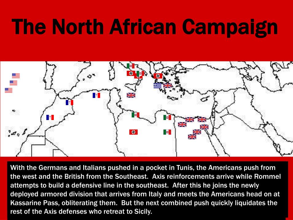 The North African Campaign After the British solidified their position and got reinforcements, the counter-attacked on December 9th and managed to drive the Italian Force clear across Libya and deep into their own territory. Here the British stopped like the Italians did (Due to their support of Greece). It would prove to be a fatal error as Mussolini called for help from Hitler; who sent the quick makings of what would soon become the infamous Afrika Korp with Erwin Rommel leading it. Finally for the last time, Rommel strikes back and pushes to the railway station of El Alemain. Here A second prepared counter attack by Montgomery, the new General of the British 8th army known as the “Desert Rats,” pushes Rommel way past Libya and Tripoli. At the same time the Americans land in North Africa and Take the Vicky French by surprise. With the Germans and Italians pushed in a pocket in Tunis, the Americans push from the west and the British from the Southeast. Axis reinforcements arrive while Rommel attempts to build a defensive line in the southeast. After this he joins the newly deployed armored division that arrives from Italy and meets the Americans head on at Kassarine Pass, obliterating them. But the next combined push quickly liquidates the rest of the Axis defenses who retreat to Sicily. With the Arrival of the Afrika Korps in Tripoli, the combined Italian and German Force pushes the British back across Libya and into Egypt once again. Also a garrison of Australians hold Tobruk which hinders German and Italian supply lines. For a week this continues and the Axis forces realize they must snuff out Malta to fix the supply situation on the Italian and DAK forces. But even with all the bombing, nothing changes. With his lack of supplies, Rommel must retreat after a renewed Allied assault. In the process of the battle some of his men get surrounded east of Tobruk and hold out for a few months. Rommel and the rest of the Axis forces are pushed back once again back into their corner of Libya. After the Blitzkrieg of France Mussolini feels that he needs to gain glory for his nation as well as himself, so he begins to stockpile men and material in Italian controlled Libya and Ethiopia. He plans to invade Egypt and kick out the British presence there. On Sept 13th, 1940 the Italians invade Egypt. They immensely overwhelm the British defenders and proceed to push forward for three days at a crawling pace. They go only fifty miles and then stop, and proceed to start making garrisons. The English retreat and begin to build forces for a counterattack since the Italians wont finish them off.