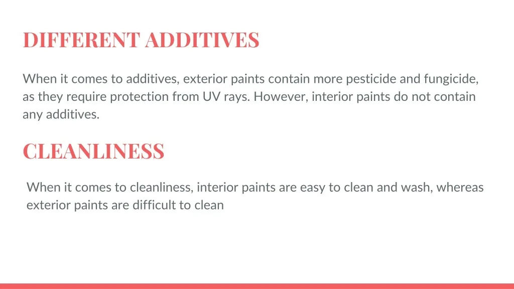 DIFFERENT ADDITIVES CLEANLINESS When it comes to additives, exterior paints contain more pesticide and fungicide, as they require protection from UV rays. However, interior paints do not contain any additives. When it comes to cleanliness, interior paints are easy to clean and wash, whereas exterior paints are difficult to clean