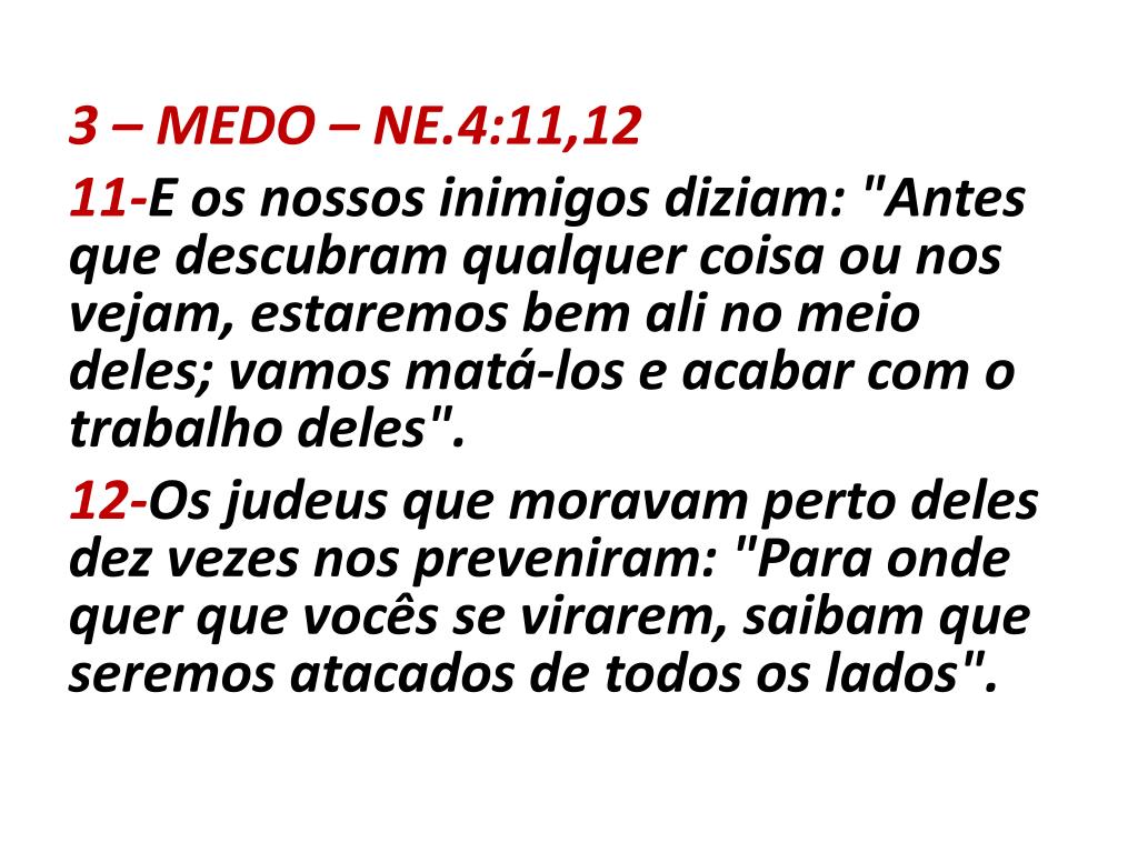 3 – MEDO – NE.4:11,12 11-E os nossos inimigos diziam: "Antes que descubram qualquer coisa ou nos vejam, estaremos bem ali no meio deles; vamos matá-los e acabar com o trabalho deles". 12-Os judeus que moravam perto deles dez vezes nos preveniram: "Para onde quer que vocês se virarem, saibam que seremos atacados de todos os lados".