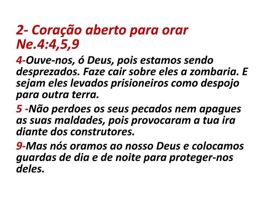 2- Coração aberto para orar Ne.4:4,5,9 4-Ouve-nos, ó Deus, pois estamos sendo desprezados. Faze cair sobre eles a zombaria. E sejam eles levados prisioneiros como despojo para outra terra. 5 -Não perdoes os seus pecados nem apagues as suas maldades, pois provocaram a tua ira diante dos construtores. 9-Mas nós oramos ao nosso Deus e colocamos guardas de dia e de noite para proteger-nos deles.