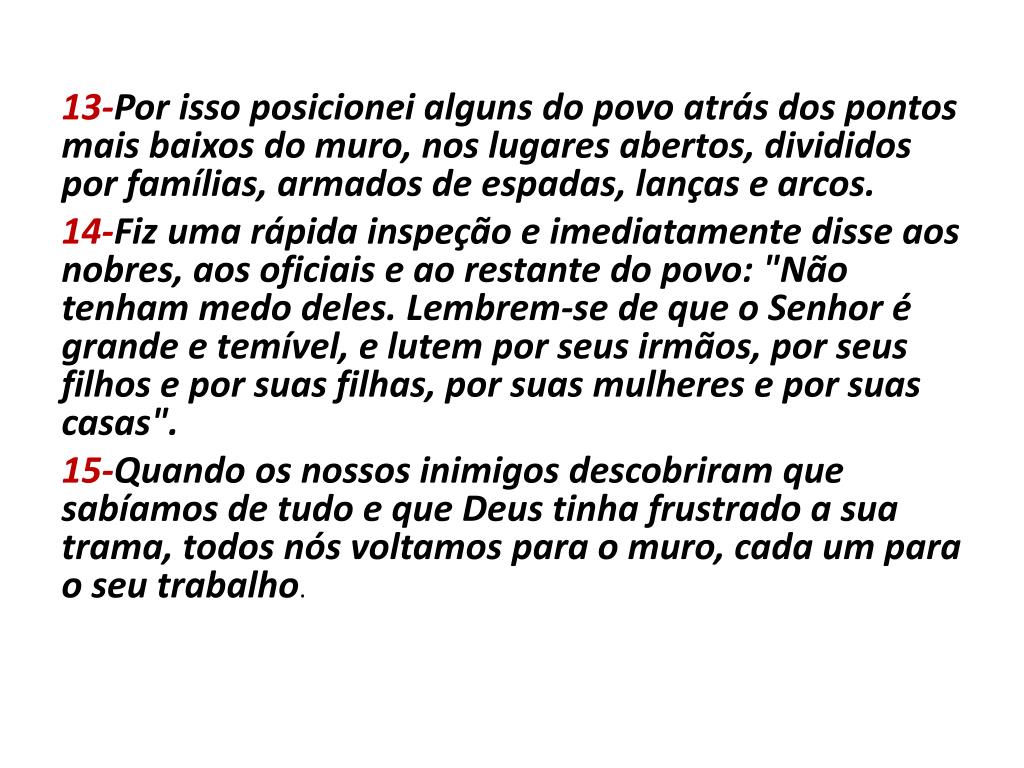13-Por isso posicionei alguns do povo atrás dos pontos mais baixos do muro, nos lugares abertos, divididos por famílias, armados de espadas, lanças e arcos. 14-Fiz uma rápida inspeção e imediatamente disse aos nobres, aos oficiais e ao restante do povo: "Não tenham medo deles. Lembrem-se de que o Senhor é grande e temível, e lutem por seus irmãos, por seus filhos e por suas filhas, por suas mulheres e por suas casas". 15-Quando os nossos inimigos descobriram que sabíamos de tudo e que Deus tinha frustrado a sua trama, todos nós voltamos para o muro, cada um para o seu trabalho.