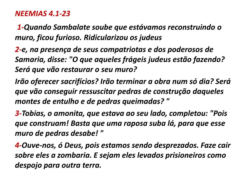 NEEMIAS 4.1-23 1-Quando Sambalate soube que estávamos reconstruindo o muro, ficou furioso. Ridicularizou os judeus 2-e, na presença de seus compatriotas e dos poderosos de Samaria, disse: "O que aqueles frágeis judeus estão fazendo? Será que vão restaurar o seu muro? Irão oferecer sacrifícios? Irão terminar a obra num só dia? Será que vão conseguir ressuscitar pedras de construção daqueles montes de entulho e de pedras queimadas? " 3-Tobias, o amonita, que estava ao seu lado, completou: "Pois que construam! Basta que uma raposa suba lá, para que esse muro de pedras desabe! " 4-Ouve-nos, ó Deus, pois estamos sendo desprezados. Faze cair sobre eles a zombaria. E sejam eles levados prisioneiros como despojo para outra terra.