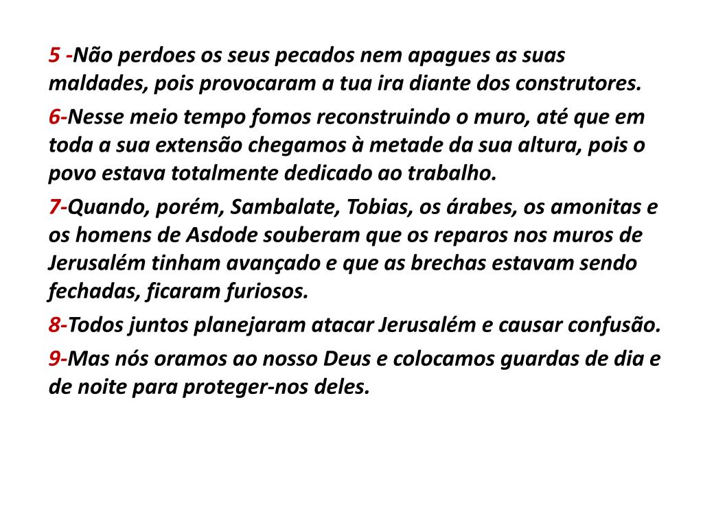 5 -Não perdoes os seus pecados nem apagues as suas maldades, pois provocaram a tua ira diante dos construtores. 6-Nesse meio tempo fomos reconstruindo o muro, até que em toda a sua extensão chegamos à metade da sua altura, pois o povo estava totalmente dedicado ao trabalho. 7-Quando, porém, Sambalate, Tobias, os árabes, os amonitas e os homens de Asdode souberam que os reparos nos muros de Jerusalém tinham avançado e que as brechas estavam sendo fechadas, ficaram furiosos. 8-Todos juntos planejaram atacar Jerusalém e causar confusão. 9-Mas nós oramos ao nosso Deus e colocamos guardas de dia e de noite para proteger-nos deles.