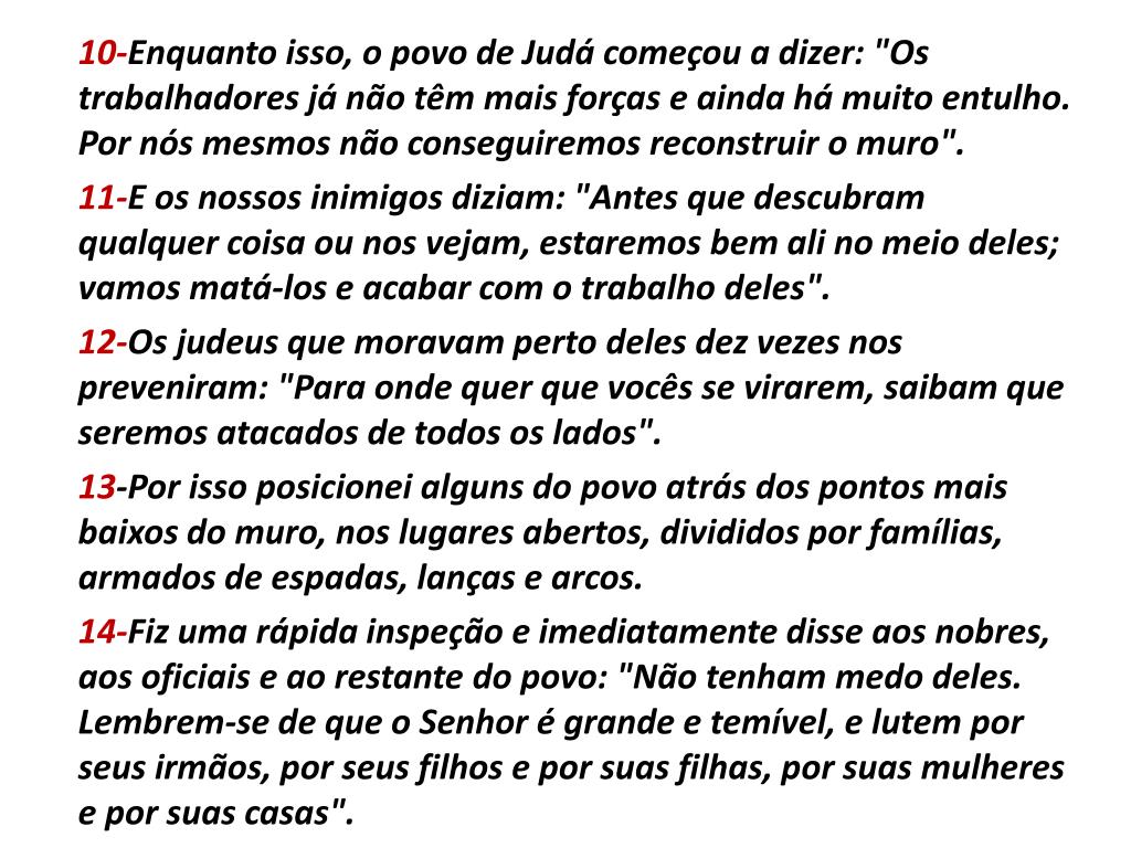 10-Enquanto isso, o povo de Judá começou a dizer: "Os trabalhadores já não têm mais forças e ainda há muito entulho. Por nós mesmos não conseguiremos reconstruir o muro". 11-E os nossos inimigos diziam: "Antes que descubram qualquer coisa ou nos vejam, estaremos bem ali no meio deles; vamos matá-los e acabar com o trabalho deles". 12-Os judeus que moravam perto deles dez vezes nos preveniram: "Para onde quer que vocês se virarem, saibam que seremos atacados de todos os lados". 13-Por isso posicionei alguns do povo atrás dos pontos mais baixos do muro, nos lugares abertos, divididos por famílias, armados de espadas, lanças e arcos. 14-Fiz uma rápida inspeção e imediatamente disse aos nobres, aos oficiais e ao restante do povo: "Não tenham medo deles. Lembrem-se de que o Senhor é grande e temível, e lutem por seus irmãos, por seus filhos e por suas filhas, por suas mulheres e por suas casas".