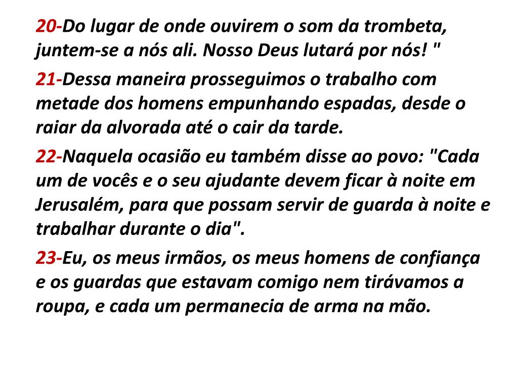 20-Do lugar de onde ouvirem o som da trombeta, juntem-se a nós ali. Nosso Deus lutará por nós! " 21-Dessa maneira prosseguimos o trabalho com metade dos homens empunhando espadas, desde o raiar da alvorada até o cair da tarde. 22-Naquela ocasião eu também disse ao povo: "Cada um de vocês e o seu ajudante devem ficar à noite em Jerusalém, para que possam servir de guarda à noite e trabalhar durante o dia". 23-Eu, os meus irmãos, os meus homens de confiança e os guardas que estavam comigo nem tirávamos a roupa, e cada um permanecia de arma na mão.