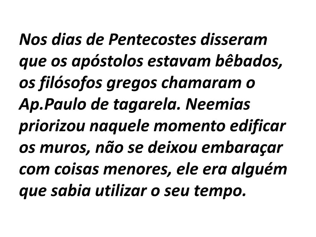 Nos dias de Pentecostes disseram que os apóstolos estavam bêbados, os filósofos gregos chamaram o Ap.Paulo de tagarela. Neemias priorizou naquele momento edificar os muros, não se deixou embaraçar com coisas menores, ele era alguém que sabia utilizar o seu tempo.