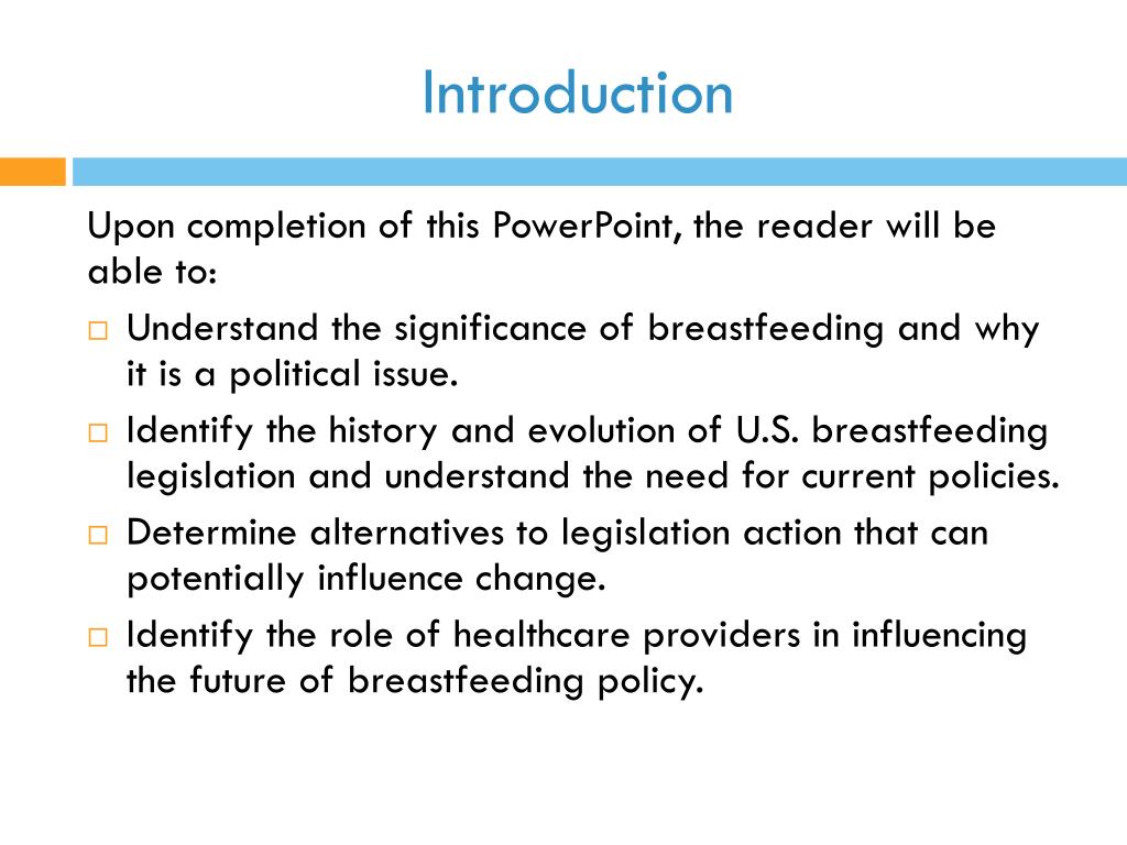Introduction Upon completion of this PowerPoint, the reader will be able to: • Understand the significance of breastfeeding and why it is a political issue. • Identify the history and evolution of U.S. breastfeeding legislation and understand the need for current policies. • Determine alternatives to legislation action that can potentially influence change. • Identify the role of healthcare providers in influencing the future of breastfeeding policy.