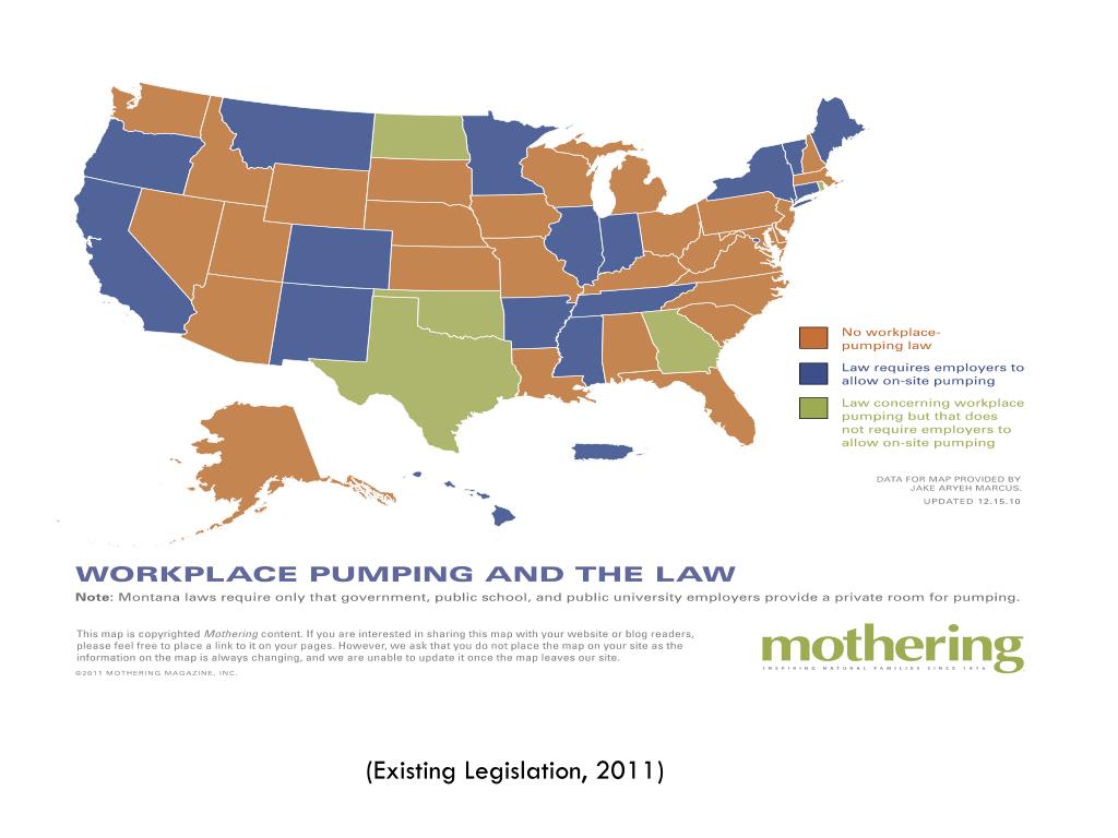 Current Policies & Initiatives: CDC Guide To Breastfeeding Interventions • CDC Guide To Breastfeeding Interventions provides state &local communities information to choose the breastfeeding intervention strategy that best meets their needs. • Support for breastfeeding is needed in many different arenas, including worksites, medical systems, and family settings. • The Guide builds upon the research that demonstrates effective interventions as well as the expertise of the nation's leading scientists and experts in breastfeeding management and interventions. (Existing Legislation, 2011)