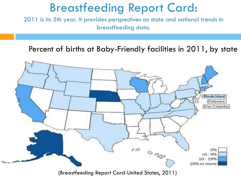 Breastfeeding Report Card:2011 is its 5th year. It provides perspectives on state and national trends in breastfeeding data. Percent of births at Baby-Friendly facilities in 2011, by state (Breastfeeding Report Card-United States, 2011)