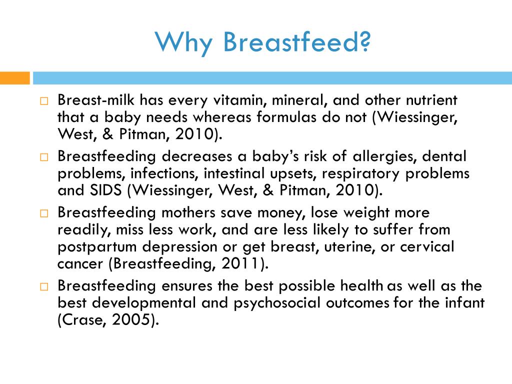 Why Breastfeed? • Breast-milk has every vitamin, mineral, and other nutrient that a baby needs whereas formulas do not (Wiessinger, West, & Pitman, 2010). • Breastfeeding decreases a baby’s risk of allergies, dental problems, infections, intestinal upsets, respiratory problems and SIDS (Wiessinger, West, & Pitman, 2010). • Breastfeeding mothers save money, lose weight more readily, miss less work, and are less likely to suffer from postpartum depression or get breast, uterine, or cervical cancer (Breastfeeding, 2011). • Breastfeeding ensures the best possible healthas well as the best developmental and psychosocial outcomesfor the infant (Crase, 2005).
