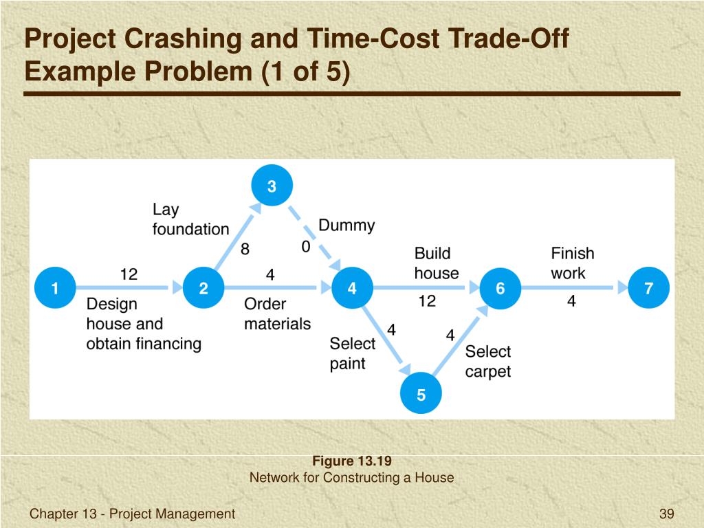 Project Crashing and Time-Cost Trade-Off Example Problem (1 of 5) Figure 13.19 Network for Constructing a House Chapter 13 - Project Management