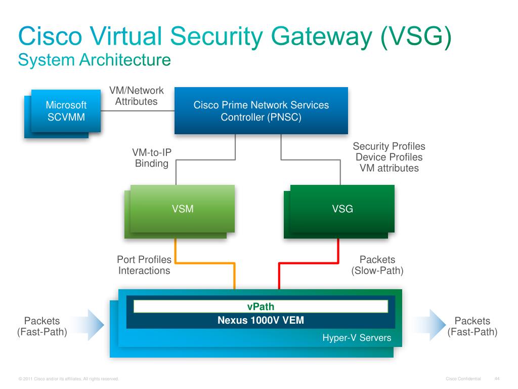 Hyper-V Servers Cisco Virtual Security Gateway (VSG)System Architecture VM/Network Attributes Cisco Prime Network Services Controller (PNSC) Microsoft SCVMM Security Profiles Device Profiles VM attributes VM-to-IP Binding VSM VSG VSM VSN Port Profiles Interactions Packets (Slow-Path) Nexus 1000V VEM vPath Packets (Fast-Path) Packets (Fast-Path)