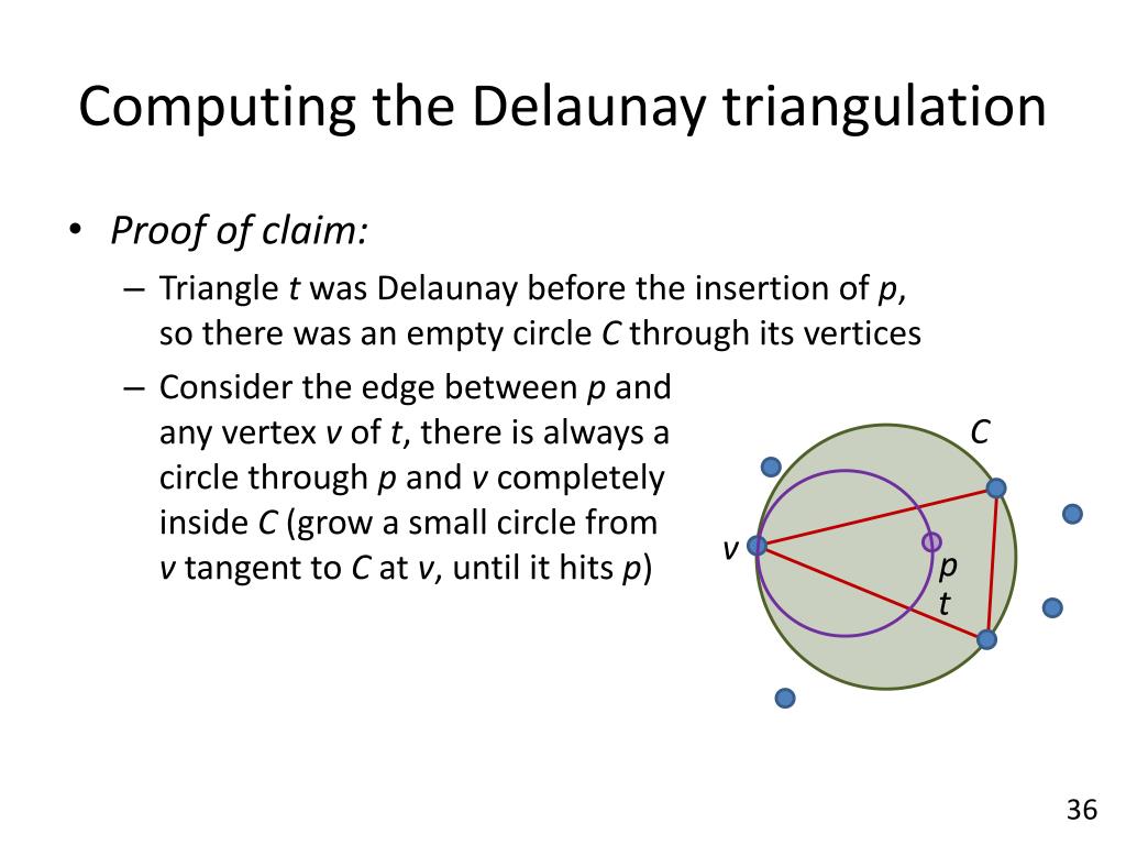 Computing the Delaunay triangulation • Proof of claim: • Triangle t was Delaunay before the insertion of p, so there was an empty circle C through its vertices • Consider the edge between p andany vertex v of t, there is always acircle through p and vcompletely inside C (grow a small circle fromv tangent to C at v, until it hits p) C v p t