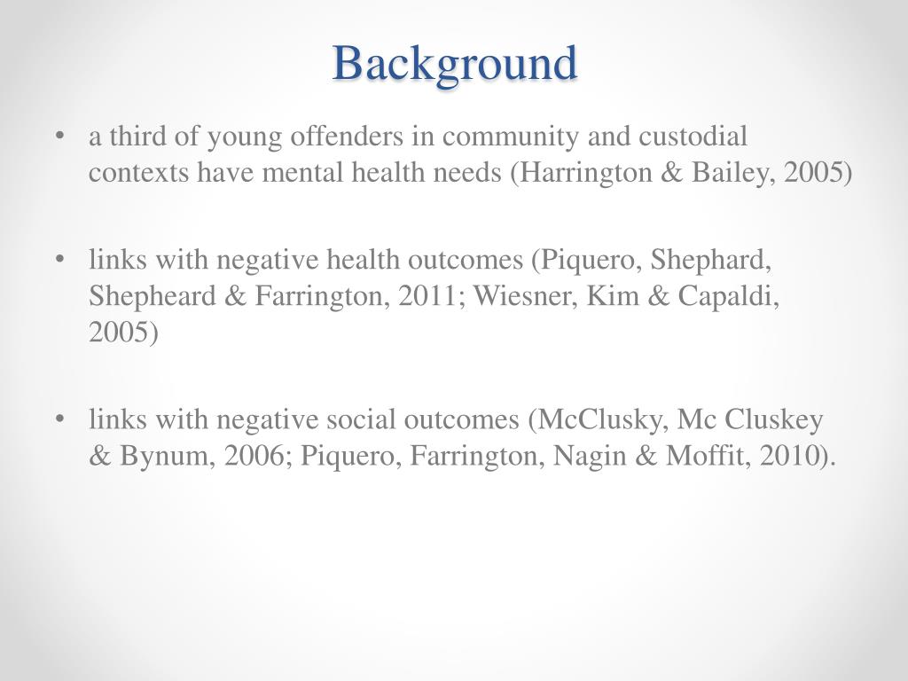 Background • a third of young offenders in community and custodial contexts have mental health needs (Harrington & Bailey, 2005) • links with negative health outcomes(Piquero, Shephard, Shepheard & Farrington, 2011; Wiesner, Kim & Capaldi, 2005) • links with negativesocial outcomes (McClusky, Mc Cluskey & Bynum, 2006; Piquero, Farrington, Nagin & Moffit, 2010).