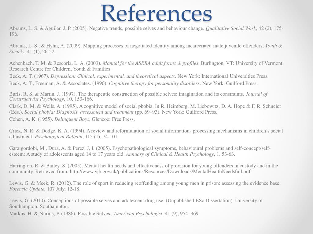 References Abrams, L. S. & Aguilar, J. P. (2005). Negative trends, possible selves and behaviour change. Qualitative Social Work, 42 (2), 175-196. Abrams, L. S., & Hyhn, A. (2009). Mapping processes of negotiated identity among incarcerated male juvenile offenders, Youth & Society, 41 (1), 26-52. Achenbach, T. M. & Rescorla, L. A. (2003). Manual for the ASEBA adult forms & profiles. Burlington, VT: University of Vermont, Research Centre for Children, Youth & Families. Beck, A. T. (1967). Depression: Clinical, experimental, and theoretical aspects. New York: International Universities Press. Beck, A. T., Freeman, A. & Associates. (1990). Cognitive therapy for personality disorders. New York: Guilford Press. Buris, R, S. & Martin, J. (1997). The therapeutic construction of possible selves: imagination and its constraints. Journal of Constructivist Psychology, 10, 153-166. Clark, D. M. & Wells, A. (1995). A cognitive model of social phobia. In R. Heimberg, M. Liebowitz, D. A. Hope & F. R. Schneier (Eds.), Social phobia: Diagnosis, assessment and treatment (pp. 69–93). New York: Guilford Press. Cohen, A. K. (1955). Delinquent Boys. Glencoe: Free Press. Crick, N. R. & Dodge, K. A. (1994). A review and reformulation of social information- processing mechanisms in children’s social adjustment. Psychological Bulletin, 115 (1), 74-101. Garaigordobi, M., Dura, A. & Perez, J, I. (2005). Psychopathological symptoms, behavioural problems and self-concept/self- esteem: A study of adolescents aged 14 to 17 years old. Annuary of Clinical & Health Psychology, 1, 53-63. Harrington, R. & Bailey, S. (2005). Mental health needs and effectiveness of provision for young offenders in custody and in the community. Retrieved from: http://www.yjb.gov.uk/publications/Resources/Downloads/MentalHealthNeedsfull.pdf Lewis, G. & Meek, R. (2012). The role of sport in reducing reoffending among young men in prison: assessing the evidence base. Forensic Update, 107 July, 12-18. Lewis, G. (2010). Conceptions of possible selves and adolescent drug use. (Unpublished BSc Dissertation). University of Southampton: Southampton. Markus, H. & Nurius, P. (1986). Possible Selves. American Psychologist, 41 (9), 954–969