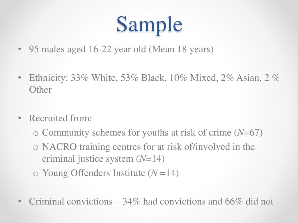 Sample • 95 males aged 16-22 year old (Mean 18 years) • Ethnicity: 33% White, 53% Black, 10% Mixed, 2% Asian, 2 % Other • Recruited from: • Community schemes for youths at risk of crime (N=67) • NACRO training centres for at risk of/involved in the criminal justice system (N=14) • Young Offenders Institute (N =14) • Criminal convictions – 34% had convictions and 66% did not