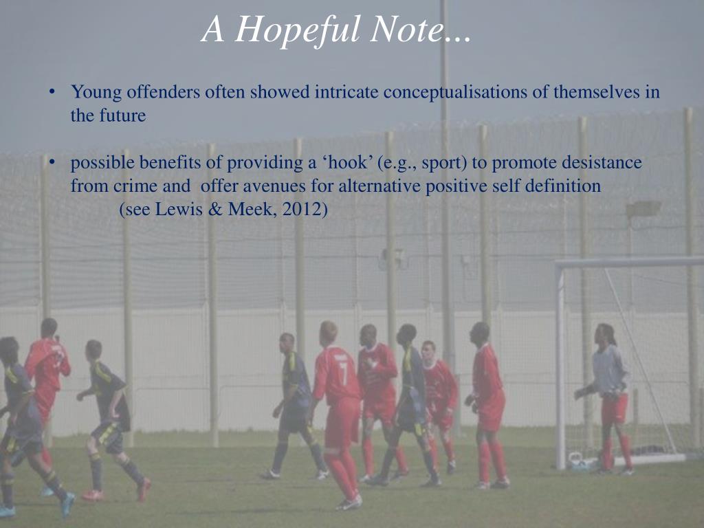 A Hopeful Note... • Young offenders often showed intricate conceptualisations of themselves in the future • possible benefits of providing a ‘hook’ (e.g., sport) to promote desistance from crime and offer avenues for alternative positive self definition • (see Lewis& Meek, 2012)