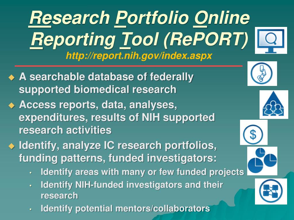 Research Portfolio Online Reporting Tool (RePORT) http://report.nih.gov/index.aspx A searchable database of federally supported biomedical research Access reports, data, analyses, expenditures, results of NIH supported research activities Identify, analyze IC research portfolios, funding patterns, funded investigators: Identify areas with many or few funded projects Identify NIH-funded investigators and their research Identify potential mentors/collaborators