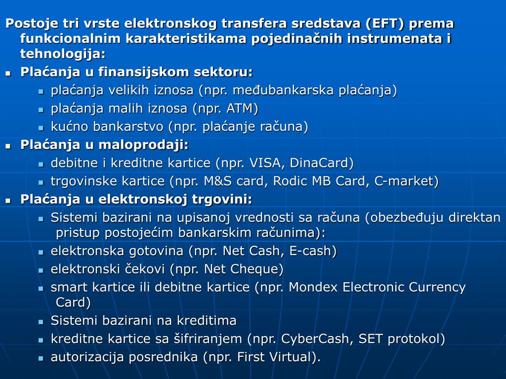 Postoje tri vrste elektronskog transfera sredstava (EFT) prema funkcionalnim karakteristikama pojedinačnih instrumenata i tehnologija: • Plaćanja u finansijskom sektoru: • plaćanja velikih iznosa (npr. međubankarska plaćanja) • plaćanja malih iznosa (npr. ATM) • kućno bankarstvo (npr. plaćanje računa) • Plaćanja u maloprodaji: • debitne i kreditne kartice (npr. VISA, DinaCard) • trgovinske kartice (npr. M&S card, Rodic MB Card, C-market) • Plaćanja u elektronskoj trgovini: • Sistemi bazirani na upisanoj vrednosti sa računa (obezbeđuju direktan pristup postojećim bankarskim računima): • elektronska gotovina (npr. Net Cash, E-cash) • elektronski čekovi (npr. Net Cheque) • smart kartice ili debitne kartice (npr. Mondex Electronic Currency Card) • Sistemi bazirani na kreditima • kreditne kartice sa šifriranjem (npr. CyberCash, SET protokol) • autorizacija posrednika (npr. First Virtual).