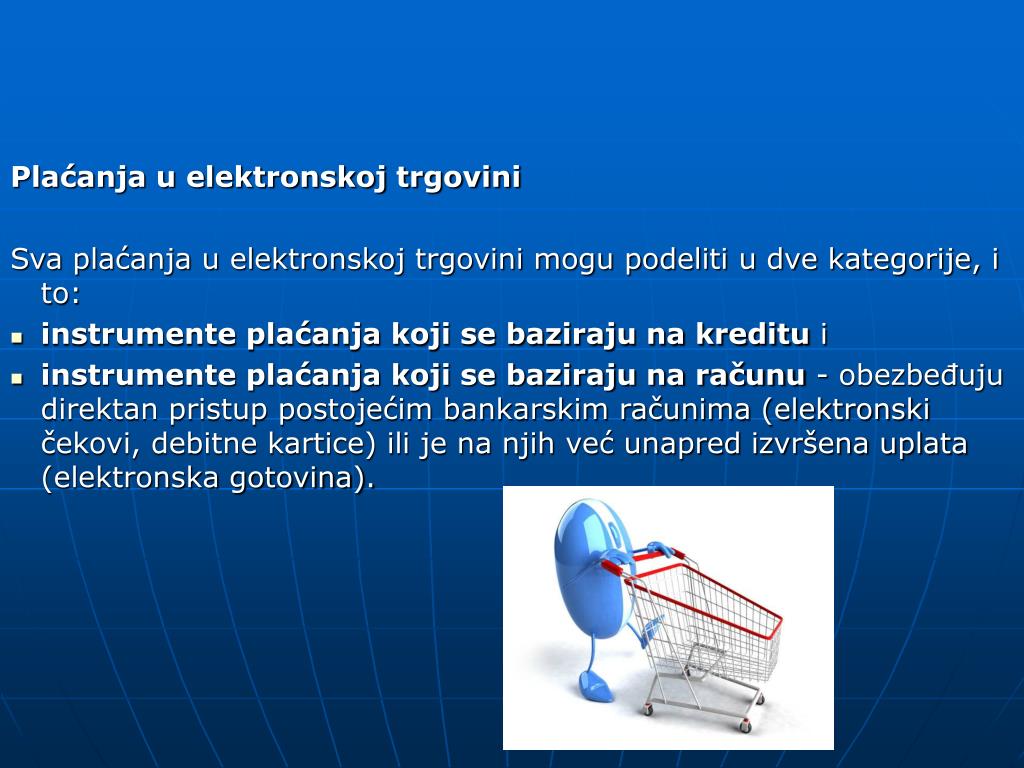 Plaćanja u elektronskoj trgovini Sva plaćanja u elektronskoj trgovini mogu podeliti u dve kategorije, i to: • instrumente plaćanja koji se baziraju na kreditu i • instrumente plaćanja koji se baziraju na računu - obezbeđuju direktan pristup postojećim bankarskim računima (elektronski čekovi, debitne kartice) ili je na njih već unapred izvršena uplata (elektronska gotovina).