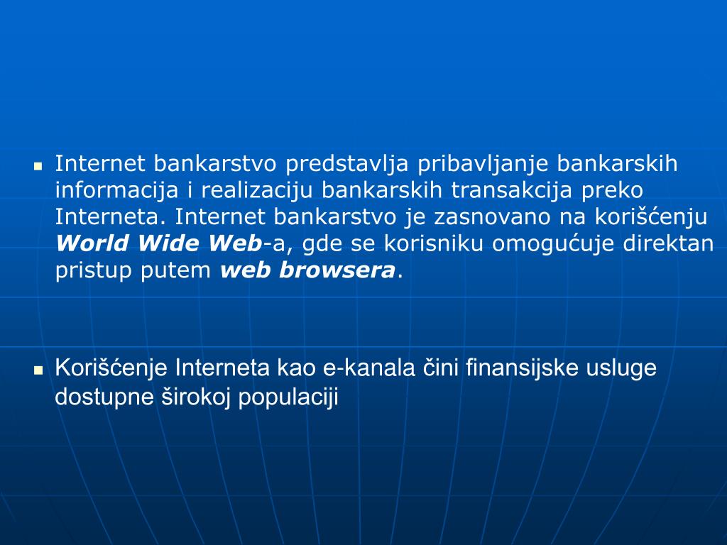 Internet bankarstvo predstavlja pribavljanje bankarskih informacija i realizaciju bankarskih transakcija preko Interneta. Internet bankarstvo je zasnovano na korišćenju World Wide Web-a, gde se korisniku omogućuje direktan pristup putem web browsera. • Korišćenje Interneta kao e-kanala čini finansijske usluge dostupne širokoj populaciji