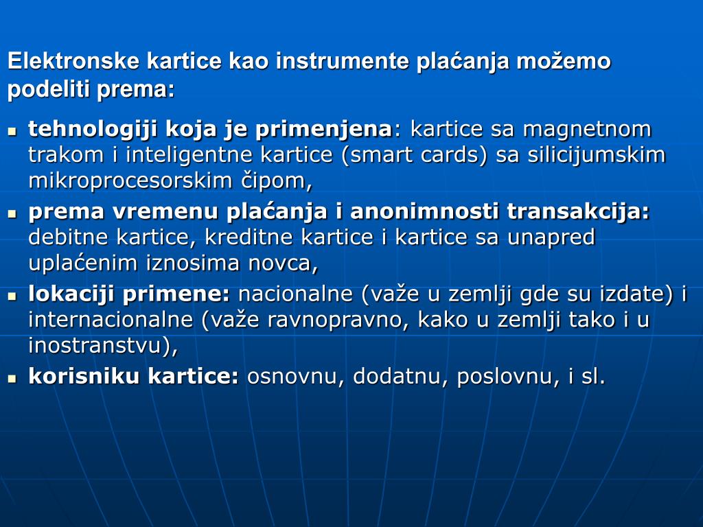 Elektronske kartice kao instrumente plaćanja možemo podeliti prema: • tehnologiji koja je primenjena: kartice sa magnetnom trakom i inteligentne kartice (smart cards) sa silicijumskim mikroprocesorskim čipom, • prema vremenu plaćanja i anonimnosti transakcija: debitne kartice, kreditne kartice i kartice sa unapred uplaćenim iznosima novca, • lokaciji primene: nacionalne (važe u zemlji gde su izdate) i internacionalne (važe ravnopravno, kako u zemlji tako i u inostranstvu), • korisniku kartice: osnovnu, dodatnu, poslovnu, i sl.