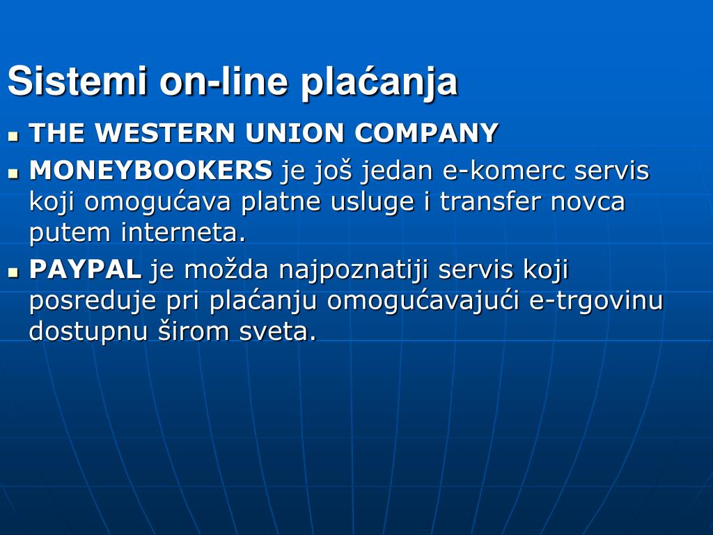 Sistemi on-line plaćanja • THE WESTERN UNION COMPANY • MONEYBOOKERS je još jedan e-komerc servis koji omogućava platne usluge i transfer novca putem interneta. • PAYPAL je možda najpoznatiji servis koji posreduje pri plaćanju omogućavajući e-trgovinu dostupnu širom sveta.